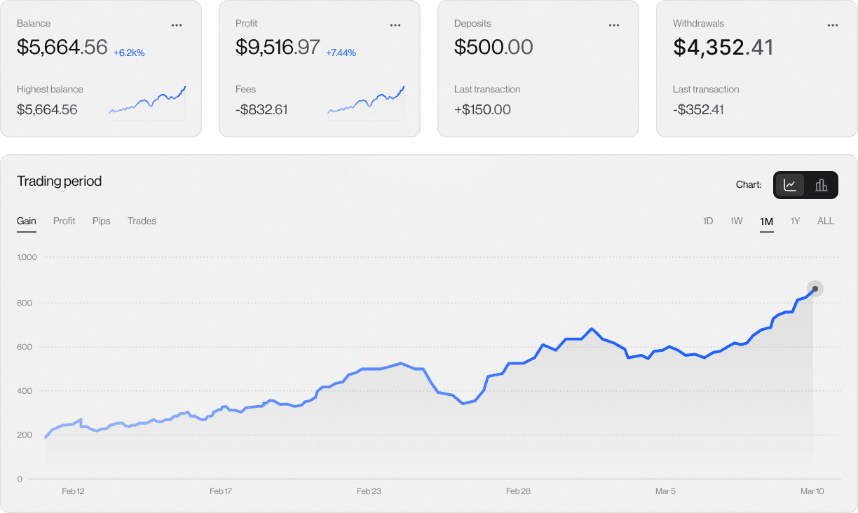 Monitor capital, performance, and risk metrics in real time - across all strategies. Designed for experienced investors who value control, transparency, and complete visibility into their holdings.