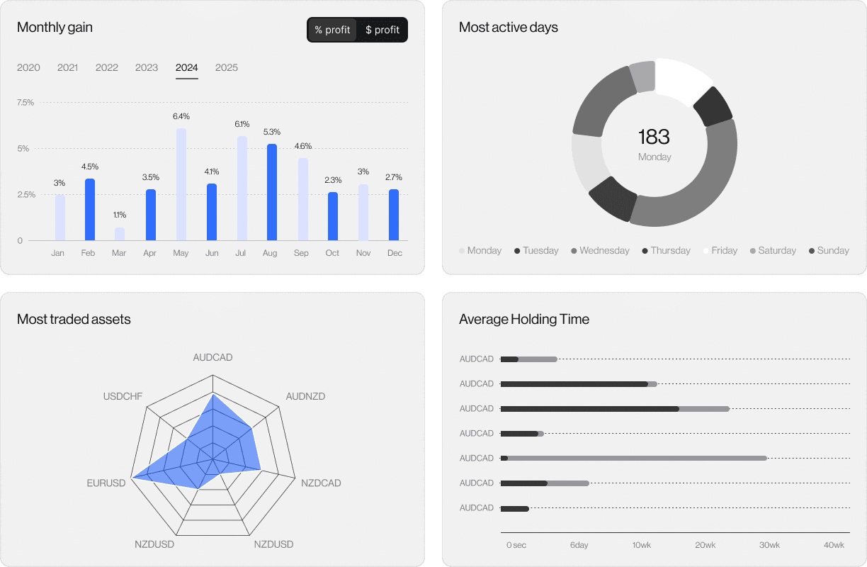 Analyze monthly gains, trading frequency, and asset behavior. Identify patterns across time, instruments, and holding durations to refine strategy efficiency.